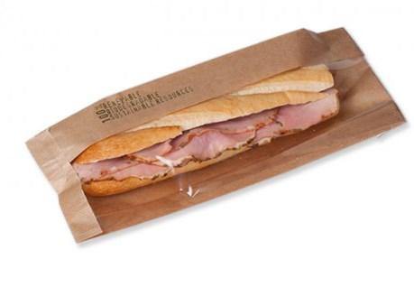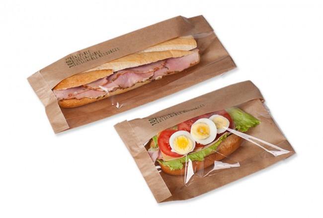 Tüte für Baguettes mit Fenster. Die Baguettetüte ist aus PEFC-Material mit einem Natureflex Bioplastik-Fenster hergestellt. Das Fenster geht über die Hälfte der Falte, damit man das Produkt schön sehen kann. Das Fenster hält eine Temperatur bis 130°C aus.